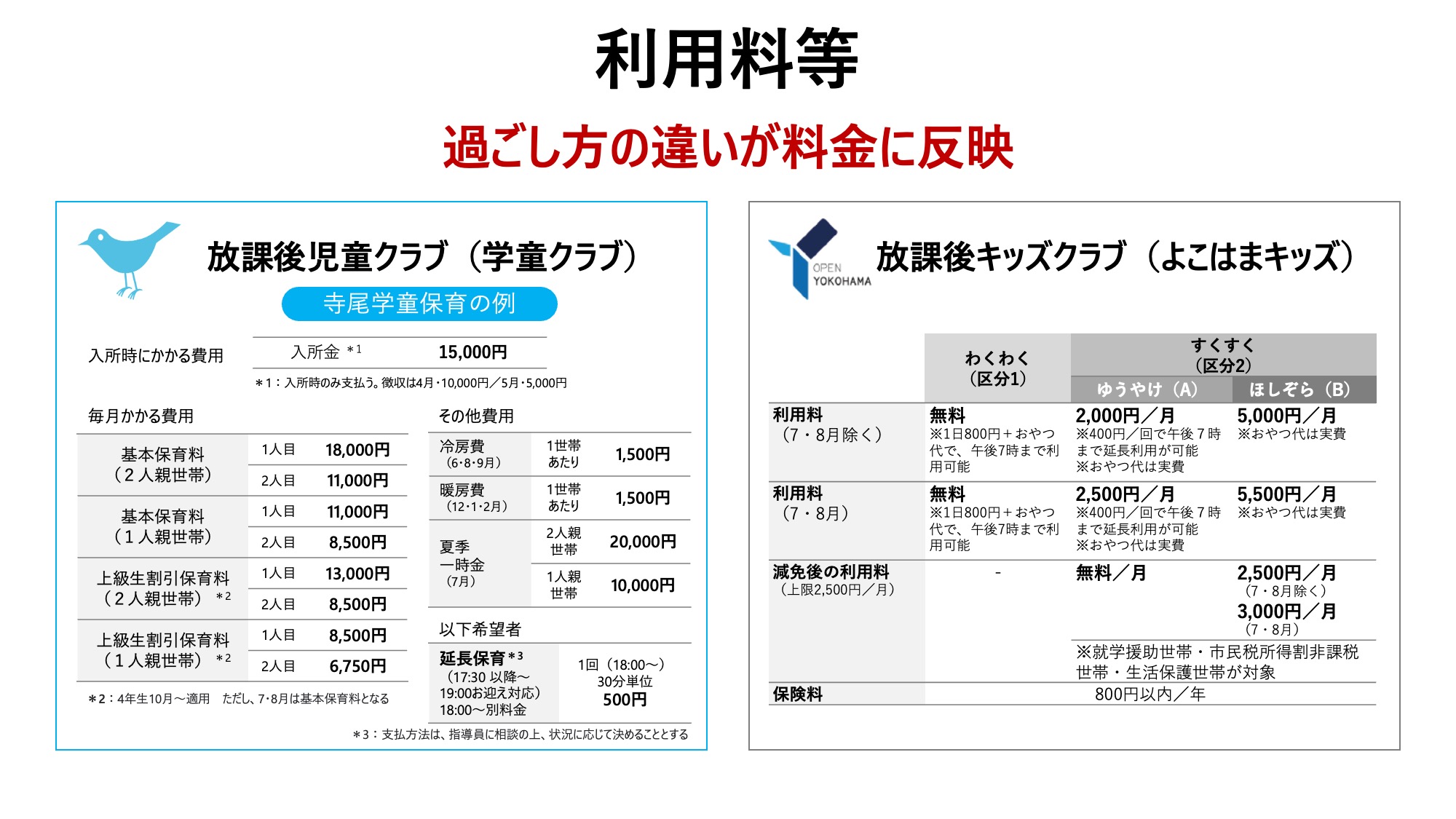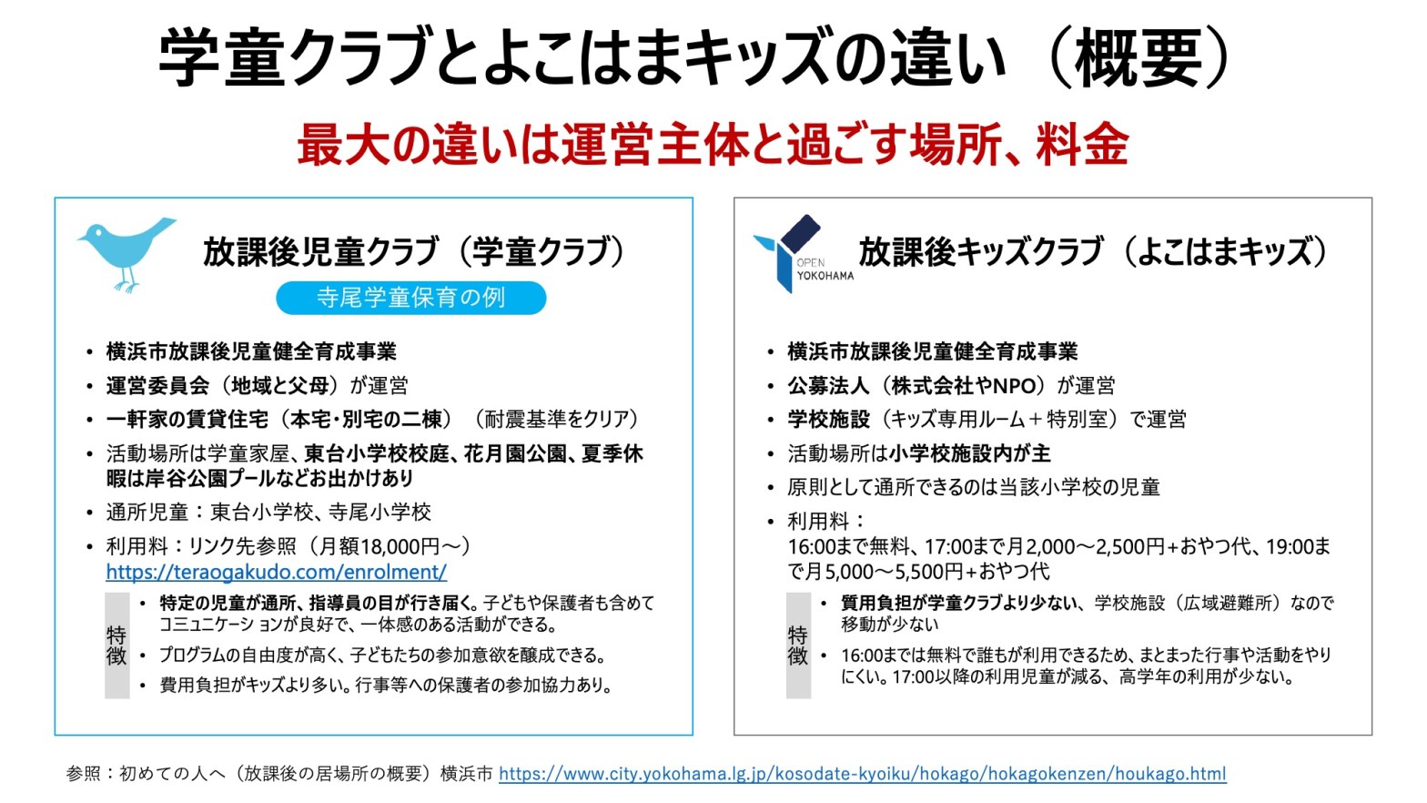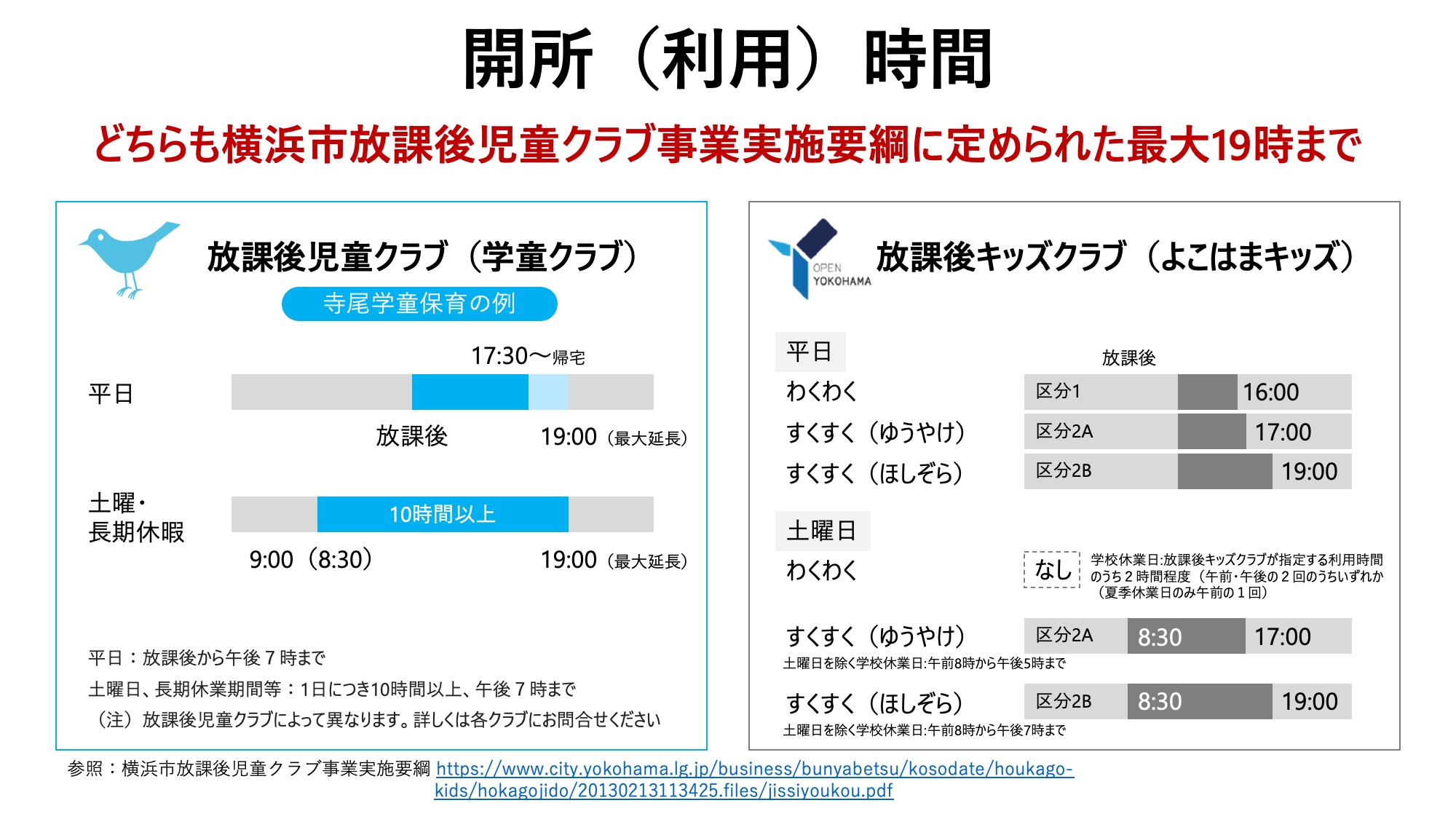 シンプルに分けると、学童クラブは放課後の時間に保育が難しい家庭を対象としていて、よこはまキッズは区分1が全員対象、区分2が留守家庭等(諸条件があります)を対象としています。