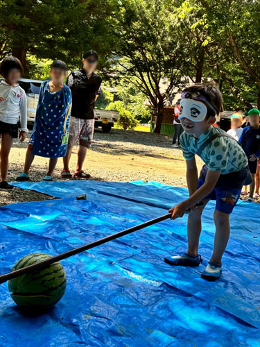「もっと右!」「そこだー!」 と、周りの声援にも熱が入ります。見事にスイカがパカっと割れた瞬間は、みんなでハイタッチ! 自分たちで割ったスイカは、この後のおやつで美味しくいただきます♪