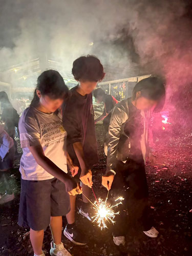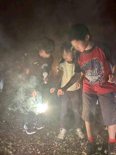 安全に注意しながら、みんなで輪になって火を灯します。パチパチと音を立てて輝く夏の風物詩に、子どもたちの顔も明るく照らされます。夜空を彩るささやかな光のショーを存分に楽しみ、楽しかった一日の思い出を語り合いました。