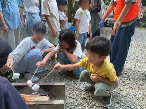 そして、子どもたちのお楽しみはデザートタイム! 炭火でとろとろに焼いたマシュマロを、クラッカーにサンドして食べる特製スイーツは大人気でした。「あつい!」「おいしい!」と、あちこちで歓声が上がり、おかわりする子が続出です。
