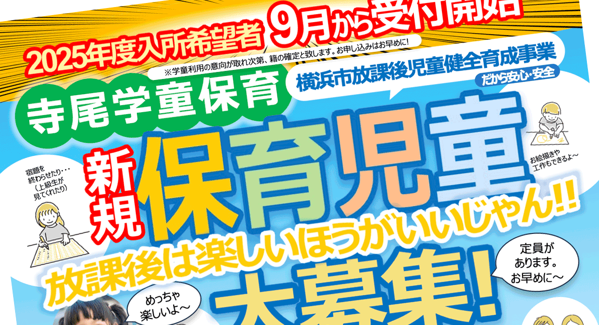 新着情報 寺尾学童保育の日常をお届けします。子どもたちの毎日がハッピーでありますように、あたたかく見守っていただけるとうれしいです。 鶴見区役所にて学童保育紹介の掲示(〜25/2/28まで) 2025年2月17日 放課後児童クラブ(学童クラブ)と放課後キッズクラブ(よこはまキッズ)はどう違うのか? 徹底解説します 2025年2月14日 寺尾学童保育 2025年 新年のごあいさつ 2025年1月1日 寺尾学童保育から年末のごあいさつ 2024年12月28日 「小学1年生の壁」を乗り越える秘策は「学童保育」! (4) 子ども同士のコミュニケーションが複雑化し、子どもが見えにくくなる問題 2024年12月13日 「小学1年生の壁」を乗り越える秘策は「学童保育」! (3)長期休み期間の預け先がない問題 2024年11月11日 第48回地域ふれあい祭(2024.11.3)大盛況でした! 2024年11月8日 「小学1年生の壁」を乗り越える秘策は「学童保育」! (2)圧倒的に子どもの相談をする機会が少ない問題 2024年10月25日 第48回地域ふれあい祭(2024.11.3)に参加します! 2024年10月24日 「小学1年生の壁」を乗り越える秘策は「学童保育」! (1)そもそも子どもが帰ってくる時間が早い問題 2024年10月10日 10/19(土)・20(日)は『わくわく!こどもデー in 横浜北仲フェス 市役所でHappy Halloween』 2024年10月3日 2025年度入所説明会のチラシを配布しています 2024年10月2日 前ページ 次ページ 登録 下にメールアドレスを入力いただくと、最新情報をお届けします。 メールアドレスを入力… 購読 共有: Email a link to a friend (新しいウィンドウで開きます) メールアドレス 印刷 (新しいウィンドウで開きます) 印刷 X で共有 (新しいウィンドウで開きます) X Facebook で共有 (新しいウィンドウで開きます) Facebook Share on Threads (新しいウィンドウで開きます) Threads X で共有 (新しいウィンドウで開きます) X Blueskyで共有する (新しいウィンドウで開きます) Bluesky いいね 読み込み中…